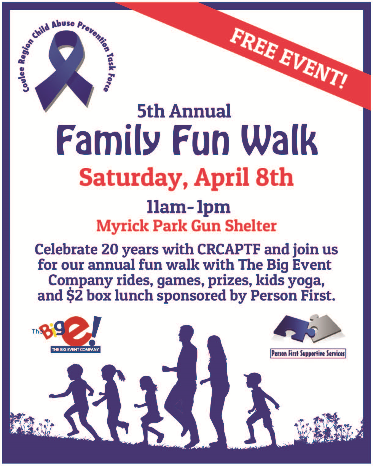 See the flyer below for information about the Coulee Region Child Abuse Prevention Task Force’s 5th Annual Family Fun Walk, happening Saturday, April 8th!