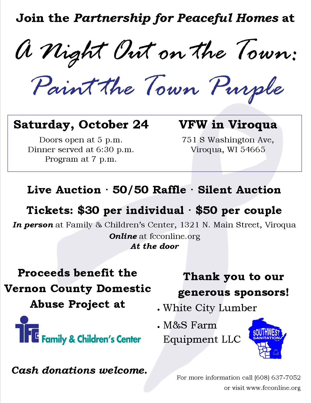 Family & Children’s Center’s second annual fundraiser to raise money for Vernon County’s Domestic Abuse Project (DAP) returns this weekend. A Night Out on the Town: Paint the Town Purple will be held Saturday, October 24 at 5 p.m. at the VFW in Viroqua, Wisconsin.