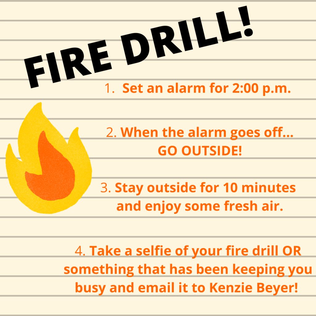 Don’t forget to snap a selfie during your fire drill and send it to Kenzie Beyer at kbeyer@fccnetwork.org. If you don’t want to send a selfie, then send a picture of something that has been keeping you active during this time. For example, maybe you have a new hobby or maybe you have accomplished projects that have been on your list for a while! Share these photos by Thursday, May 14th and we will share on the Depot!