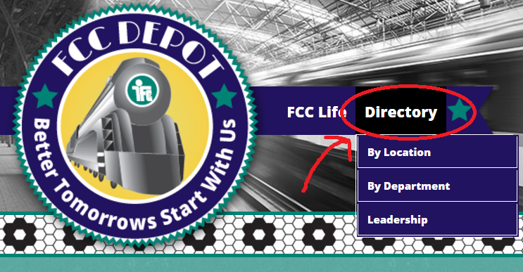 First, click the word “Directory” itself, as shown below. This will bring up the full list of all FCC staff (be patient, it may take a few extra seconds to load all those smiling faces!)