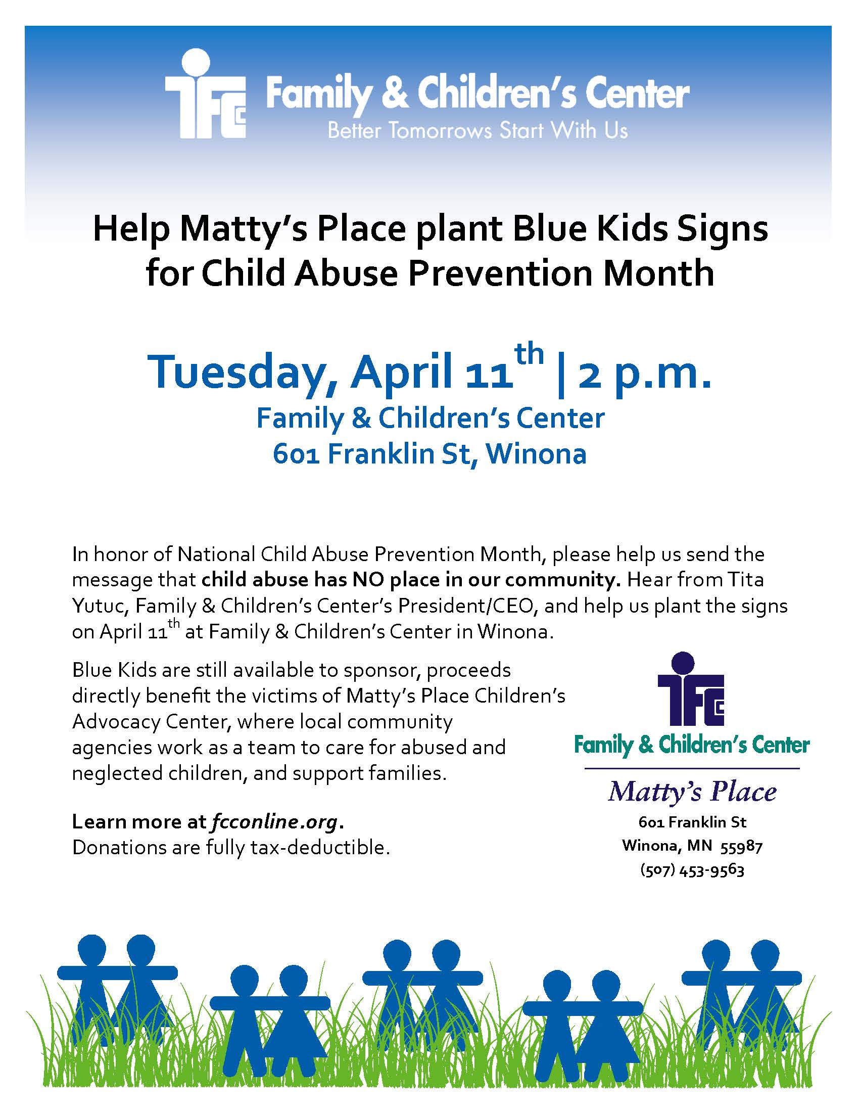 This Tuesday, April 11th at 2pm, join us at our Franklin Street building in Winona to plant Blue Kids signs for Child Abuse Prevention Month. Please see the flyer below for more information.