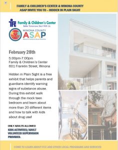 A great event is coming up next week at Family & Children’s Center in Winona. FCC and Winona County ASAP are hosting a Hidden in Plain Sight exhibit next Thursday, February 28 from 5:00-7:00 at our Franklin Street Building. This event is designed for parents to attend to learn how to identify warning signs for substance abuse. We will also have Winona Volunteer Services, Legacies, Winona County ASAP, as well as FCC staff here to share information about the services each group offers.