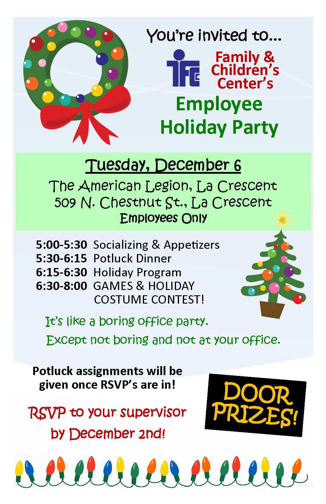 The FCC Employee Holiday Party is TODAY! If you forgot to RSVP, don’t worry! If you didn’t bring a dish, no problem! We still want to see your smiling face and celebrate with you. See you all tonight!