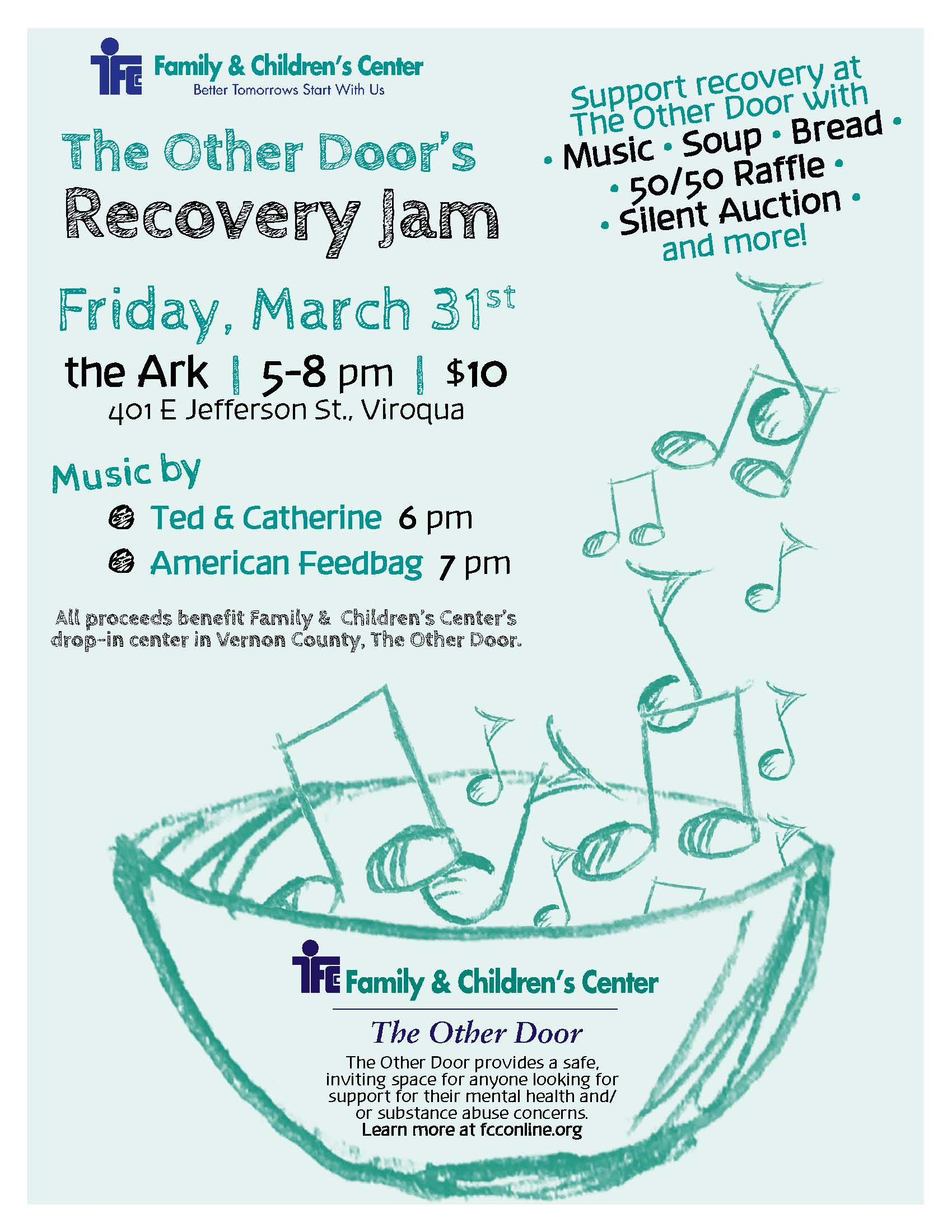 Join Family & Children’s Center’s Vernon County drop-in center, The Other Door, for their annual fundraiser—Recovery Jam! The event is full of homemade soup (courtesy of Viroqua staff!), bread, treats, 50/50 raffle, silent auction and MUSIC! Enjoy artists Ted & Catherine and American Feedbag.