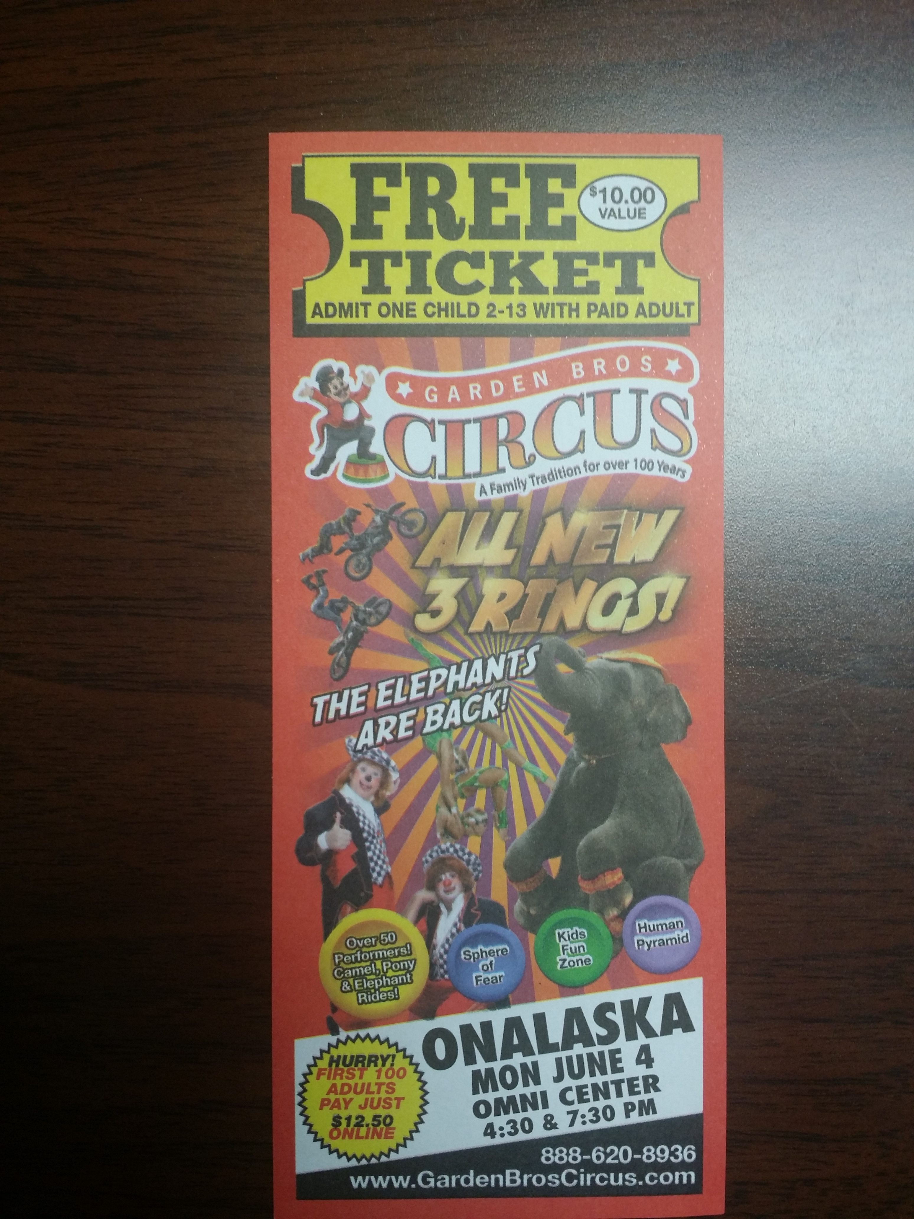 We just received 30 tickets from the Garden Bros Circus that takes place this Monday, June 4th.