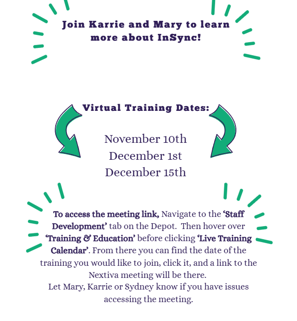 Lunch and Learn on 11/10/25 will be an open discussion to understand comfortability with InSync and what areas of training are still needed.