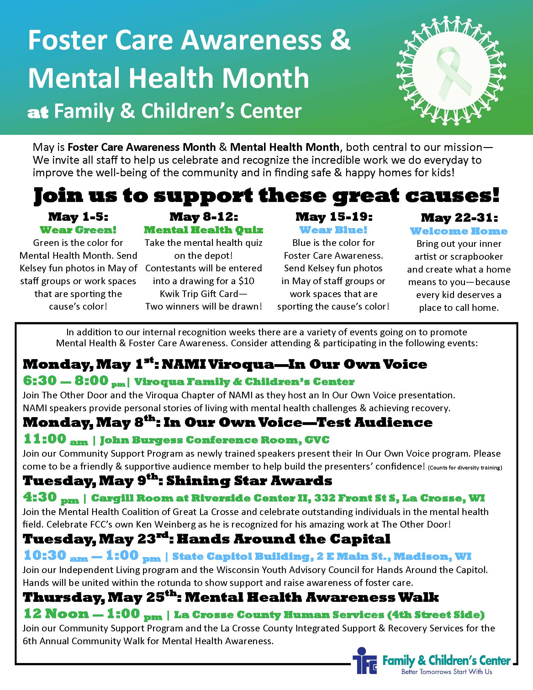 May is Foster Care Awareness Month & Mental Health Month. See the flyer below for information on ways to support these causes: