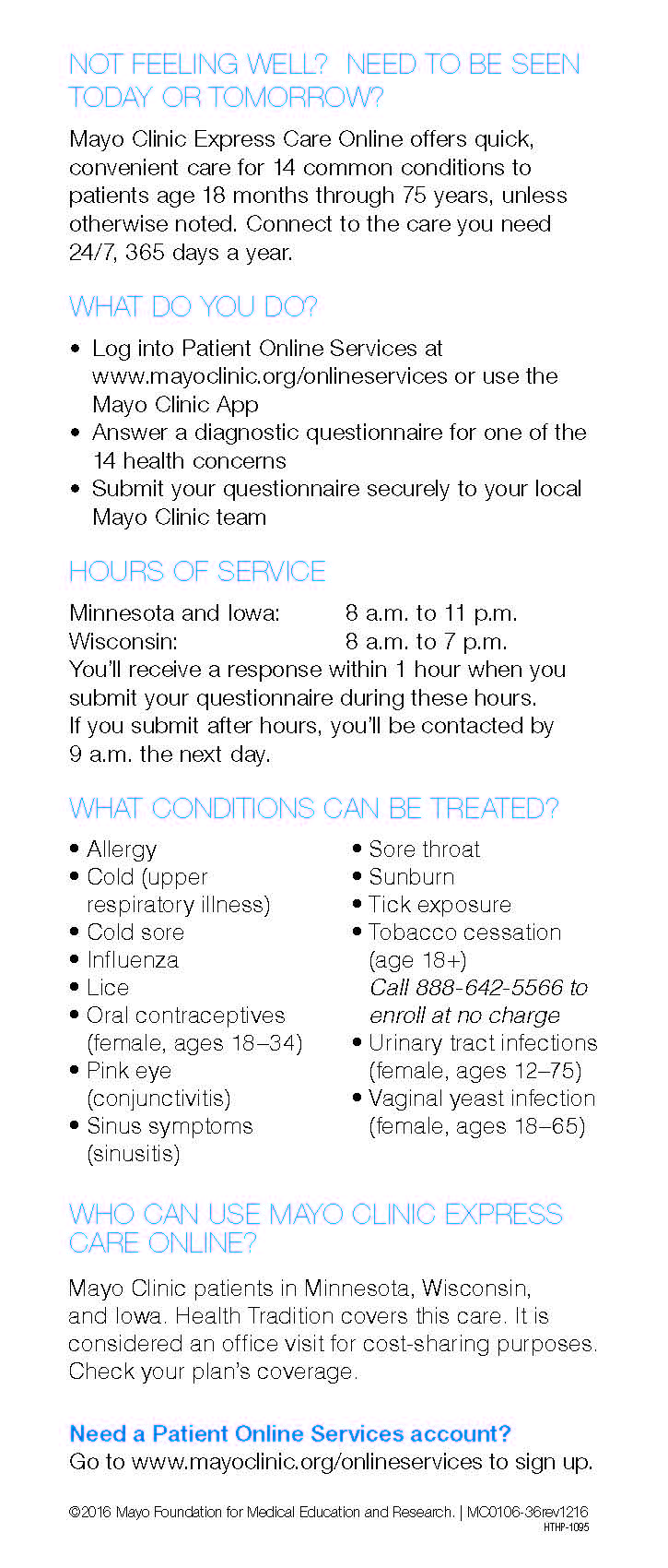 Minor health concerns that require time off from work can now be treated more conveniently… at less cost… with Mayo Clinic Express Care Online. Read on in the flyer below or learn more at HealthTradition.com.