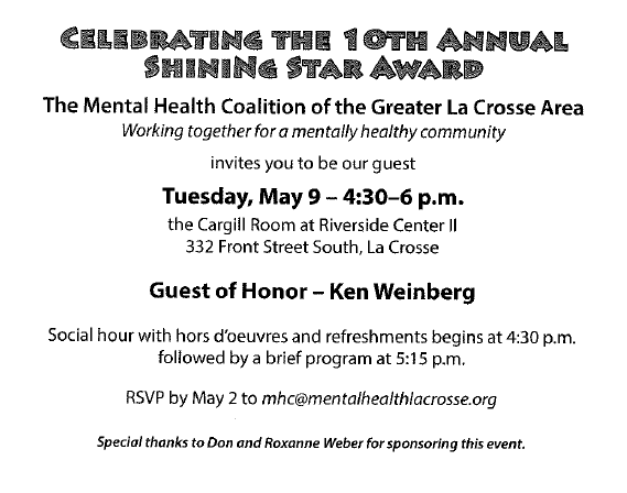 Ken Weinberg, FCC employee at the Viroqua office, is being honored by the Mental Health Coalition for his amazing work with the Other Door Drop In Center program and for his work with NAMI, offering the Recovery through Sharing Peer Support Group at the drop in center. Ken is a powerful force for good and his example through his own recovery offers hope to all around him.