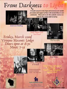 March 22nd 7-11 p.m. Viroqua Masonic Lodge. 1/2, 118 S Main St, Viroqua, WI 54665
