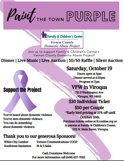 Paint the Town Purple supports the Domestic Abuse Project by raising awareness and funds to make families safer in Vernon County. Enjoy live music, fun games, learn about the domestic abuse project and how it impacts the community and enjoy good company to support a great cause!