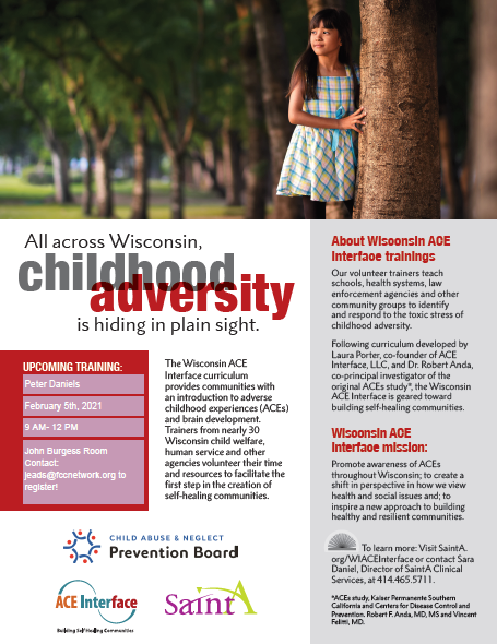 Don’t miss the upcoming ACE Interface training on Friday, February 5th from 9:00 a.m. -12:00 p.m. in the John Burgess Conference room at GVC. This training provides an introduction to adverse childhood experiences (ACEs) and brain development. If you are interested in attending please email Jen Eads at jeads@fccnetwork.org.