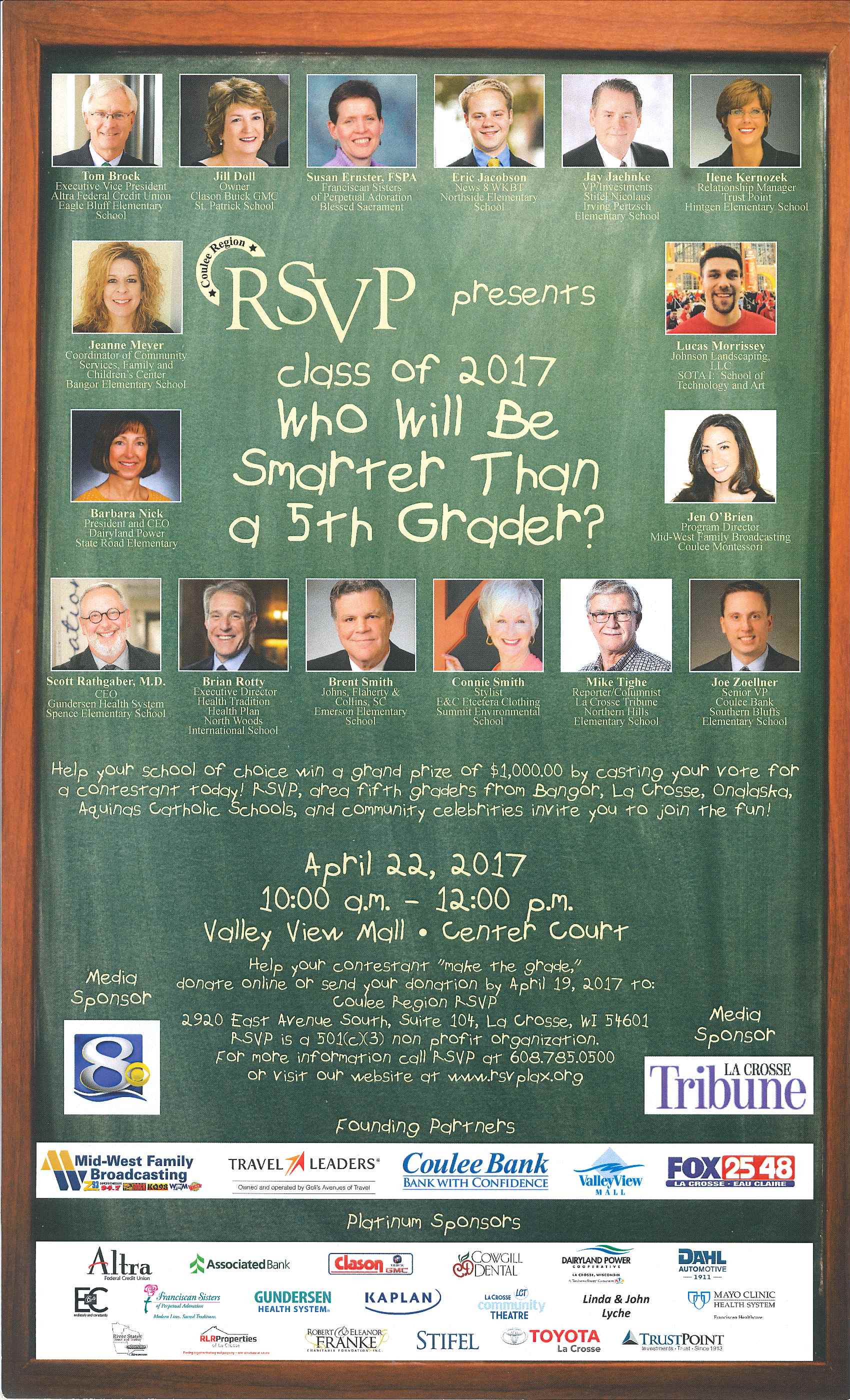 On April 22, support FCC’s own Jeanne Meyer, Coordinator of Community Services, and Jay Jaehnke, FCC Board member at Coulee Region RSVP’s event, “Who will be smarter than a 5th grader?” See the flyer below for more info!