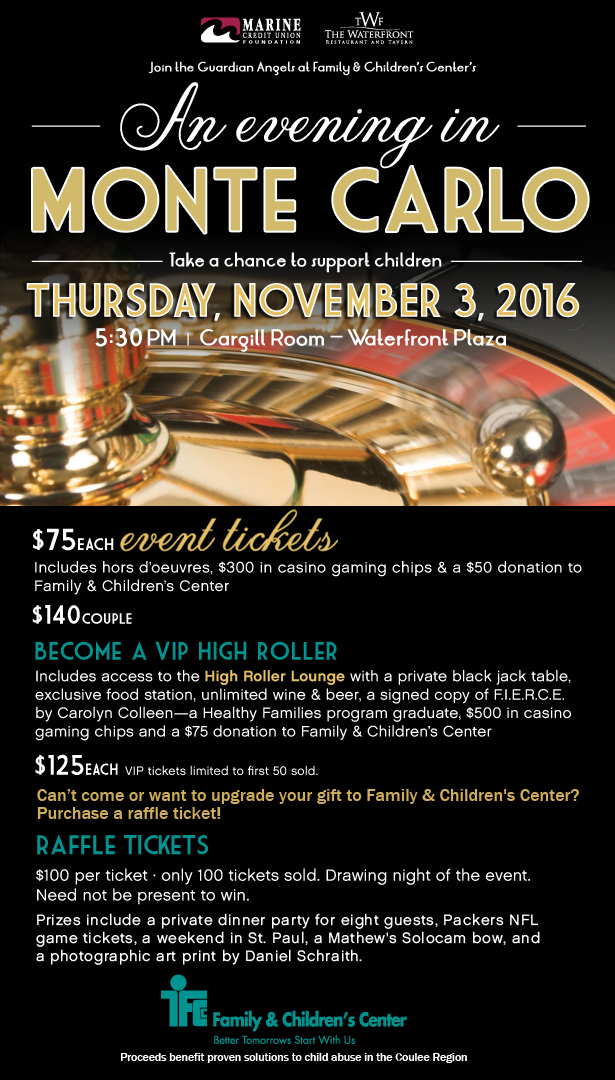 Our annual signature event, An Evening in Monte Carlo is coming up on Thursday, November 3! It’s a high-end casino night that benefits our Healthy Families and Stepping Stones programs. We have need for approximately 10-12 volunteers. Time frame for helping would be approximately 5-9:30 pm.