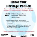 It’s potluck time – FCC employee potlucks are this week! Get ready to “Honor Your Heritage” with food, photos, and games! Black River Falls: Tuesday, March 21st at 12pm Sparta: Wednesday, March 22nd at 12pm GVC: Wednesday, March 22nd from 11:30-1pm Other locations: Ask the Culture Club member at your location! See flyer below for more